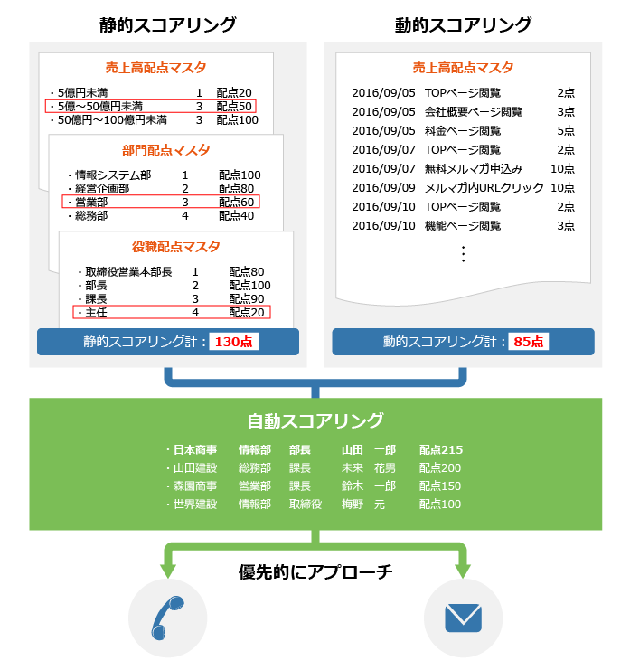 企業情報や営業履歴などさまざまな情報を蓄積し、それぞれをスコアリングすることで、マーケティングと営業のコストや時間を削減することができます。