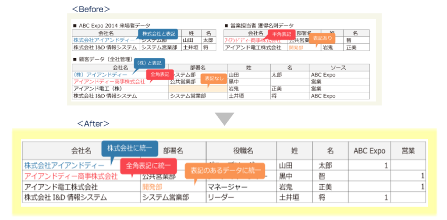 - 営業担当者などが手作業でデータ入力を行っており、同一会社が違った表記で登録されているなど、表記ゆれがある。