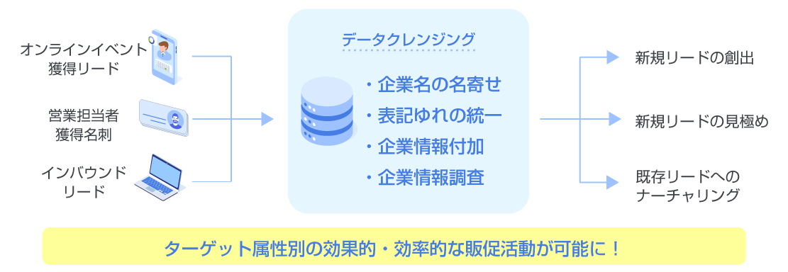 名刺管理ソフト・CRM・SFA・MA など各種管理ツール上にバラバラな状態で管理されているデータを整備して、販促活動に利用できる状態にすることを「データクレンジング」または「データクリーニング」と言います。