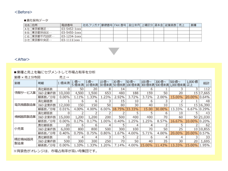 付加された企業情報をもとに、業種別の市場占有率を算出(マーケットとのマッチング)