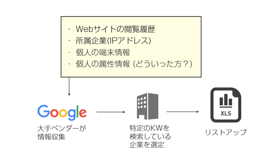 「特定の検索キーワード」でWeb検索している企業をIPアドレス単位で特定するサービスです。