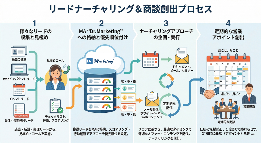 次に、これら施策で獲得したマーケティングリードをマーケティングオートメーション"Dr.Marketing®"に格納し、アプローチすべき優先順位を設定いたします。実施方法やタイミング、ご案内すべきオファーを企画し、コンテンツを作成した上で体系的にナーチャリングアプローチを代行させていただきます。