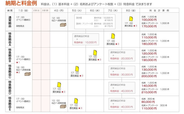 ※ 料金は、基本料金 + 名刺およびアンケート枚数 + 特急料金で決まります(下記カレンダー参照)