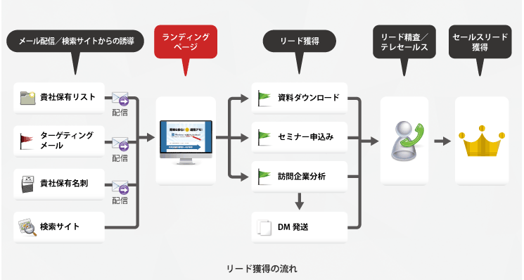 アイアンドディーがご提案するのは、貴社保有のリストや名刺、そして新たなターゲットに対し、 メールを配信することで、そのメールのリンクからの